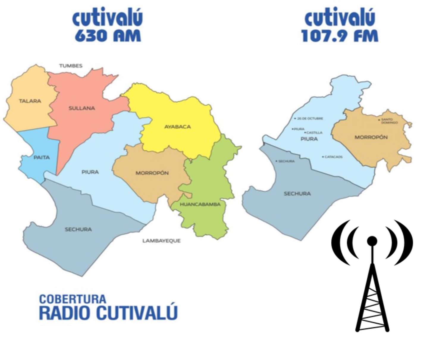 Nos escuchar en la frecuencia 630 AM (Cobertura regional rural) y 107.9 FM (Cobertura urbana Piura). También a través de nuestra web con señal en vivo, App Cutivalú y redes sociales (Facebook, instagram, Twitter, TikTok, SoundCloud y YouTube).